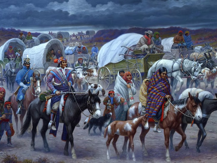 En 1838, 4 à 8 000 Cherokesse sont morts de froid, de faim ou d'épuisement, sur la « piste des larmes ». En application de l'Indian Removal Act, signé par le président Andrew Jackson, ils laissaient la côte Est des États-Unis aux Européens et acceptaient de se rendre au sud du fleuve Mississippi. Cependant, c'est aujourd'hui la seule tribu indienne a avoir réussi à maintenir son mode de vie sans être éradiquée par les Européens. Cette déportation est l'exemple suivi par Donald Trump pour mettre fin au nettoyage ethnique de la Palestine et résoudre le conflit israélo-palestinien qui s'éternise depuis 80 ans.