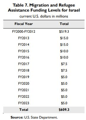 Depuis 1973, Israël a reçu un total d'environ 1,69 milliard de dollars de subventions du compte d'aide à l'immigration et aux réfugiés (MRA) du département d'État pour contribuer à la réinstallation des migrants en Israël. Les fonds sont versés à l'United Israel Appeal, une organisation philanthropique privée aux États-Unis qui, à son tour, transfère les fonds à l'Agence juive en Israël. Entre 1973 et 1991, les États-Unis ont fourni environ 460 millions de dollars au titre de la réinstallation des réfugiés Juifs en Israël. De 1992 à 1999, après l'effondrement de l'Union soviétique et la réinstallation de centaines de milliers d'immigrants Juifs en Israël, les subventions du MRA ont augmenté pour atteindre près de 80 millions de dollars par an. Depuis, les subventions diminuent en raison du nombre décroissant de juifs qui partent s'installer en Israël (voir tableau 7). L'Éthiopie reste encore un foyer d'émigration actif vers Israël, avec le soutien financier de la MRA.