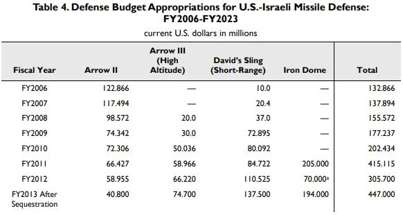 À ce jour, les États-Unis ont fourni près de 3 milliards de dollars à Israël pour des batteries du dôme de fer, des intercepteurs, des coûts de coproduction et des frais généraux d'entretien (voir le tableau 4). Étant donné que le Dôme de fer a été développé par Israël seul, Israël a initialement conservé les droits exclusifs sur la technologie. De leur côté, les États-Unis ont commencé dès 2011 à soutenir financièrement son développement, et se sont montrés intéressés à devenir un partenaire dans sa production. Le Congrès a ensuite appelé à un partage de la technologie et à une coproduction avec les États-Unis.