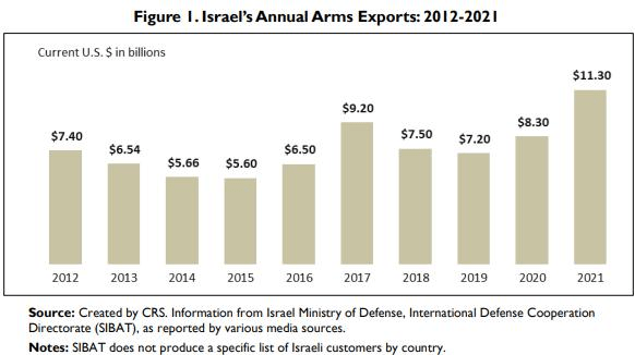 La quasi-totalité de l'aide américaine est de nature militaire et a contribué à transformer les forces armées israéliennes en l'une des armées les plus sophistiquées au monde. L'aide américaine a également permis à Israël de développer son industrie de défense, qui se classe aujourd'hui parmi les premiers exportateurs d'armes au monde. Les entreprises telles que Israel Aerospace Industries (IAI), Rafael et Elbit Systems, exportent près de 70% de leurs produits. Plutôt que de produire du matériel requérant une grosse filière industrielle (avions de combat, chars), les entreprises israéliennes se concentrent généralement sur des produits technologiques avancés (tels que des systèmes de défense antimissile, des véhicules aériens sans pilote, des produits de cybersécurité, des radars et des systèmes de communication électronique) ; l'Inde, l'Azerbaïdjan et le Vietnam sont les trois plus grands marchés d'exportation d'Israël.