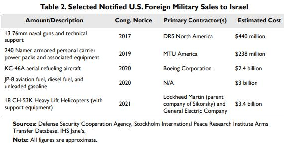 L'aide américaine et les ventes d'armes à Israël, comme pour les autres pays, sont soumises à la législation américaine. Certains groupes d'intérêt demandent régulièrement au Congrès de veiller à ce que l'aide militaire américaine à Israël soit conforme aux lois et politiques américaines en vigueur et au droit humanitaire international.