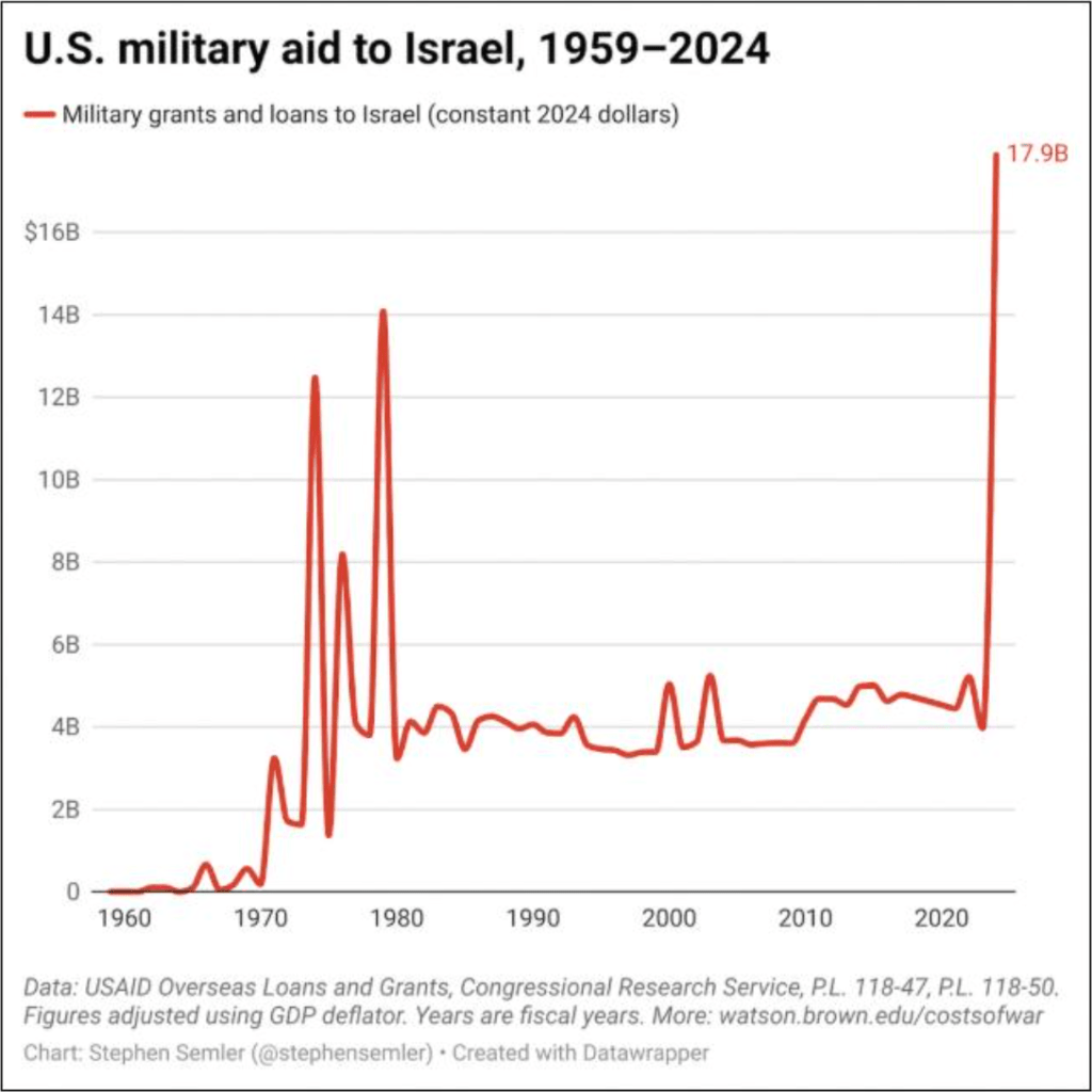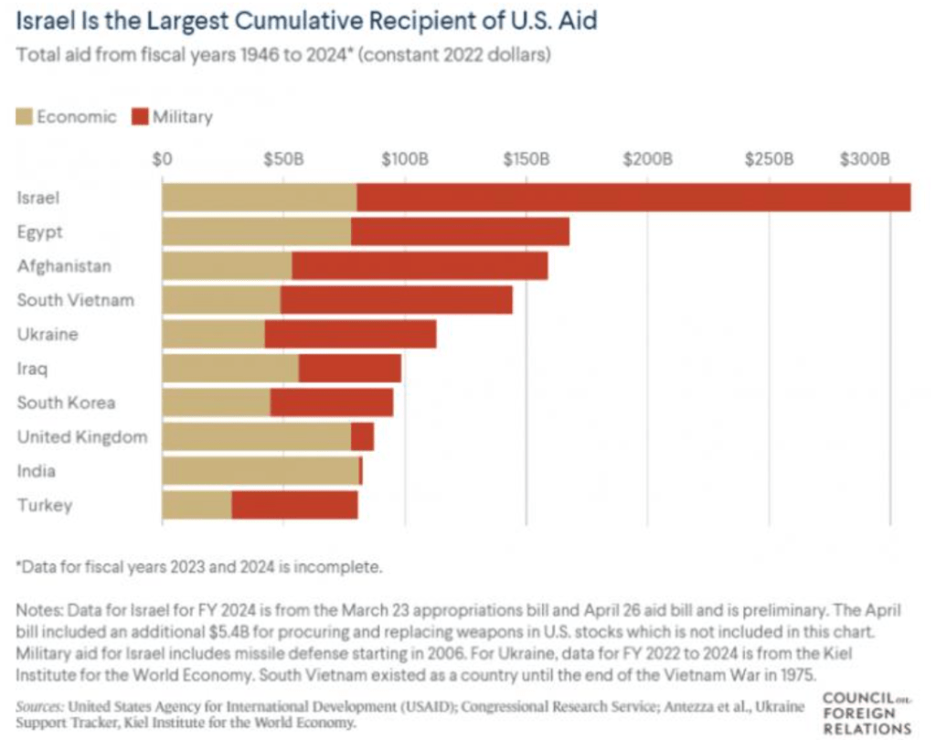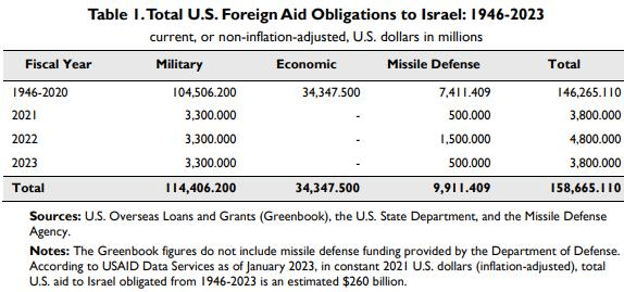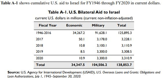 En cumul, Israël est de loin le plus grand bénéficiaire d'aide américaine depuis la Seconde Guerre mondiale. Les administrations successives, en collaboration avec le Congrès, lui ont fourni une aide qui reflète à la fois le solide consensus interne qui existe aux États-Unis en faveur d'Israël et de sa sécurité, les objectifs stratégiques communs au Moyen-Orient, l'engagement mutuel affiché en faveur des valeurs démocratiques et les liens historiques qui remontent au soutien des États-Unis à la création d'Israël en 1948. À ce jour, les États-Unis ont fourni à Israël 158 milliards de dollars (en dollars courants ou non corrigés de l'inflation) sous forme d'aide bilatérale et de financement de la défense antimissile. À l'heure actuelle, la quasi-totalité de l'aide prend la forme d'une assistance militaire ; de 1971 à 2007, Israël a également reçu une aide économique importante.