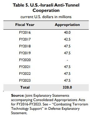 La section 1279 de la National Defense Authorization Act, P.L. 114-92, de 2016, mettait en place un programme de coopération américano-israélien de lutte contre les tunnels. Elle ouvrait l'utilisation des fonds du compte de la défense pour la recherche, le développement, les essais et l'évaluation (en combinaison avec des fonds israéliens) dans le but de développer des capacités permettant de «détecter, cartographier et neutraliser» les tunnels qui menacent les États-Unis ou Israël. L'autorisation exigeait que le secrétaire à la Défense rapporte au Congrès le partage effectif des coûts de recherche et de développement entre les deux pays.