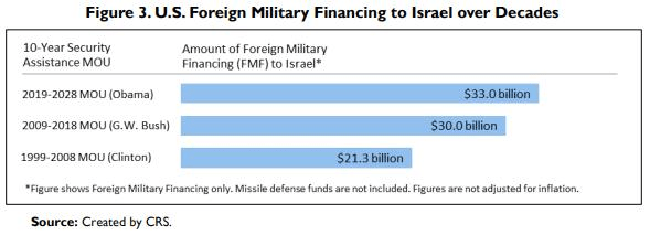 En 2016, les gouvernements américain et israélien ont signé leur troisième protocole d'accord décennal sur l'aide militaire (MOU = Memorandum of Understanding), couvrant les années 2019 à 2028. Aux termes de ce protocole, les États-Unis se sont engagés à verser - sous réserve de l'autorisation de dépense du Congrès - 38 milliards de dollars : 33 milliards sous forme de subventions au titre du financement militaire étranger (FMF = Foreign Military Financing) et 5 milliards sous forme de crédit pour la défense antimissile.
