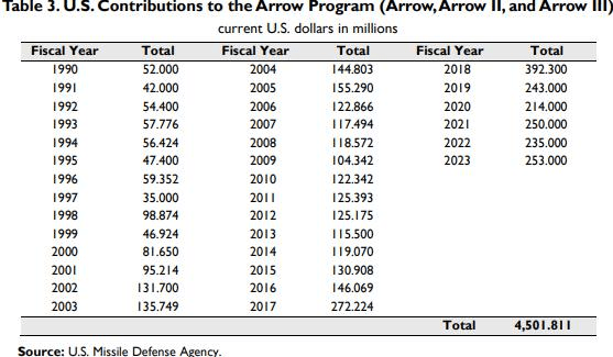Dans le cadre d'un accord de 1986 permettant à Israël de participer à l'Initiative de défense stratégique (SDI), les États-Unis et Israël ont co-développé différentes versions du missile antibalistique Arrow et, depuis 1988, se sont engagés dans un développement conjoint. Le missile Arrow est conçu pour contrer les missiles balistiques à courte portée. Les États-Unis ont financé un peu moins de la moitié des coûts annuels du développement du système d'armes Arrow, le reste étant fourni par Israël. La contribution financière totale des États-Unis (pour tous les systèmes Arrow) a dépassé 4,5 milliards de dollars (voir le tableau 3). Le système a été testé avec succès et a été mis en service en 2000 en Israël.