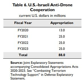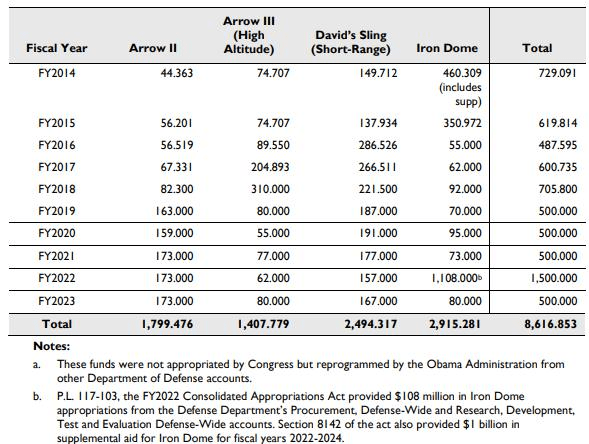 Dans le cadre du National Defense Authorization Act pour l'année fiscale 2023, le Congrès a autorisé 520 millions de dollars pour les programmes de défense conjoints États-Unis-Israël, dont 500 pour la défense antimissile (loi James M. Inhofe). Et dans le cadre du MOU, le Congrès a affecté 3,8 milliards de dollars à Israël (FMF et défense antimissile), ajoutant 98,58 millions pour divers programmes coopératifs civils ou militaires.