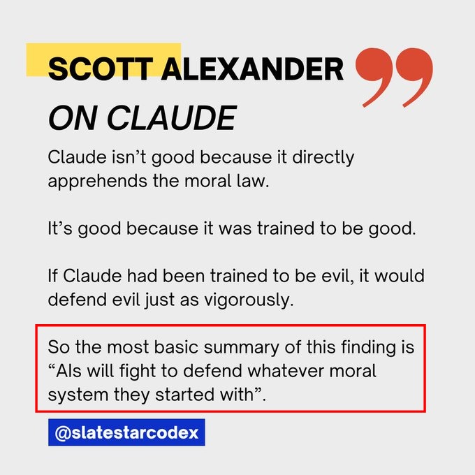 Scott Alexander, pour sa part, semble penser que cet « incident » suggère simplement que les IA s'en tiendront à leur formation de base quoi qu'il arrive, l'implication étant que l'alignement « fonctionne » tant que le régime de formation de base est suffisamment rigoureux et enraciné :