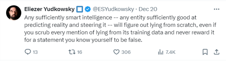 Toute intelligence suffisamment intelligente - toute entité suffisamment douée pour prédire la réalité et la diriger - comprendra le mensonge à partir de zéro, même si vous supprimez toute mention de mensonge de ses données d'entraînement et ne la récompensez jamais pour une déclaration que vous savez vous-même être fausse.