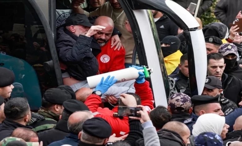Des prisonniers palestiniens libérés font le signe de la victoire après leur arrivée à l'hôpital européen de Khan Younès, dans le sud de la bande de Gaza, dans le cadre de l'accord d'échange de prisonniers.