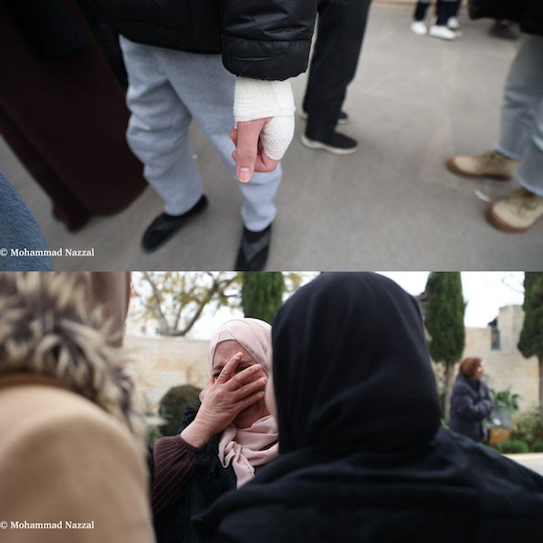 Une mère palestinienne n'a pas pu retenir ses larmes en voyant son fils, libéré samedi, blessé à la main après avoir été agressé par les forces d'occupation juste avant sa libération.