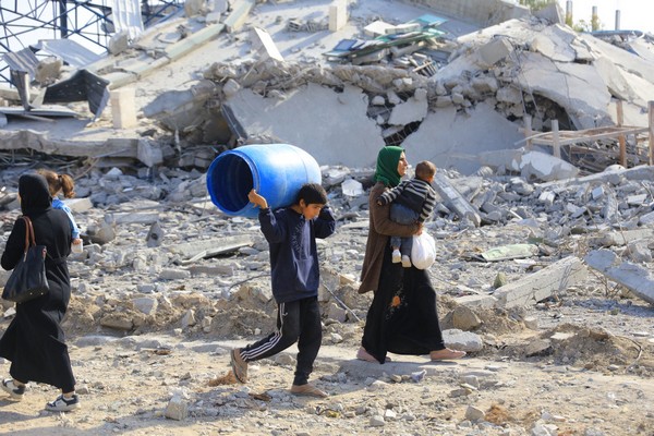 © WHO. Des Palestiniens déplacés retournent dans leurs maisons suite à l'accord de cessez-le-feu à Gaza.