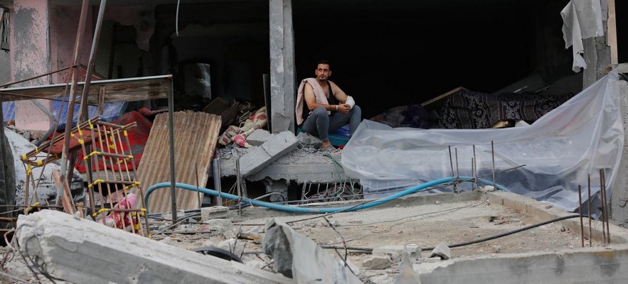 © UNRWA. Un homme est assis dans un bâtiment gravement endommagé à Nuseirat, à Gaza (photo d'archives