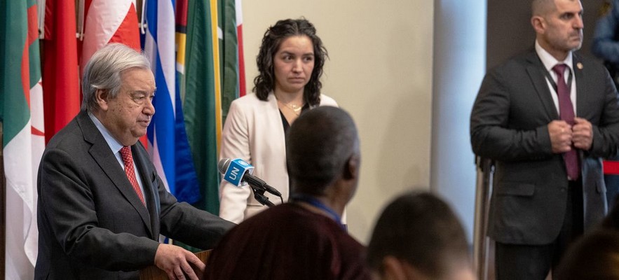 Photo ONU/Manuel Elias. Le Secrétaire général de l'ONU, António Guterres (à gauche), s'adresse aux médias au siège de l'ONU après l'annonce d'un cessez-le-feu à Gaza.