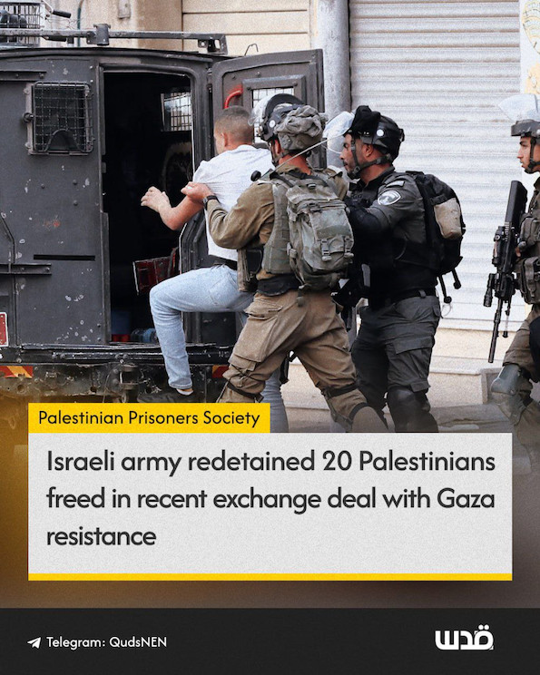 Près de 20 détenus palestiniens récemment libérés dans le cadre de l'accord d'échange de prisonniers ont été ré-arrêtés et sont à nouveau détenus par Israël, selon la Société des prisonniers palestiniens.