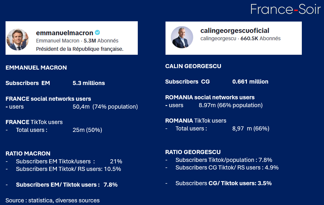 The numbers speak for themselves: Georgescu has 3.5% of followers on TikTok while Macron has more than double that with 7.8%.