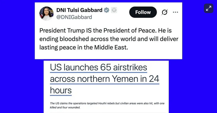 Les États-Unis ont lancé 65 frappes aériennes en 24 heures sur le Yémen, puis Tulsi Gabbard, chef du renseignement de Trump, a tweeté