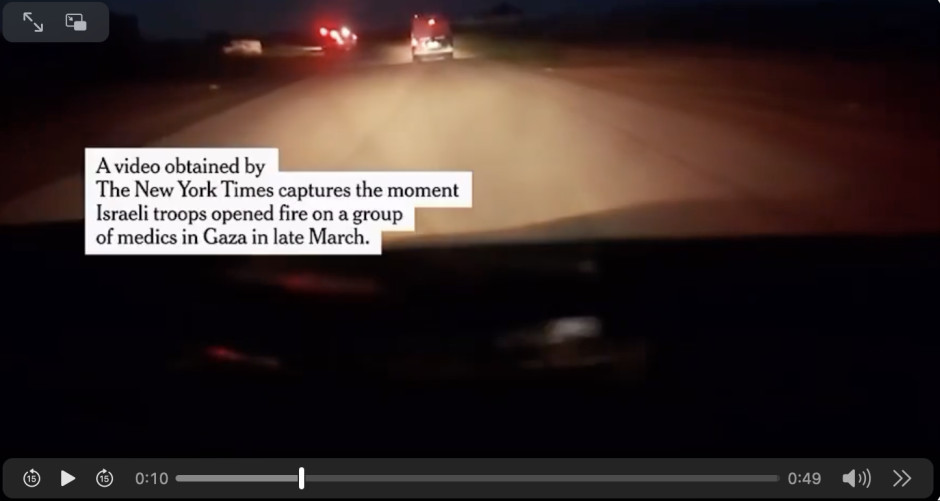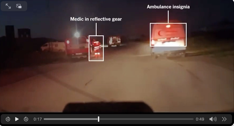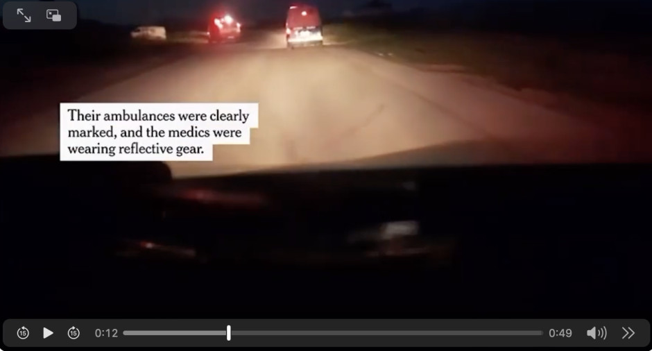 Une vidéo récupérée sur le téléphone d'un ambulancier palestinien assassiné montre des ambulances et des camions de pompiers clairement identifiés avec leurs feux de détresse clignotants, quelques instants avant que les forces israéliennes n'ouvrent le feu. Les véhicules n'étaient pas banalisés. Ils ne s'approchaient pas subrepticement. Ils exécutaient une mission soutenue par l'ONU pour récupérer les blessés.