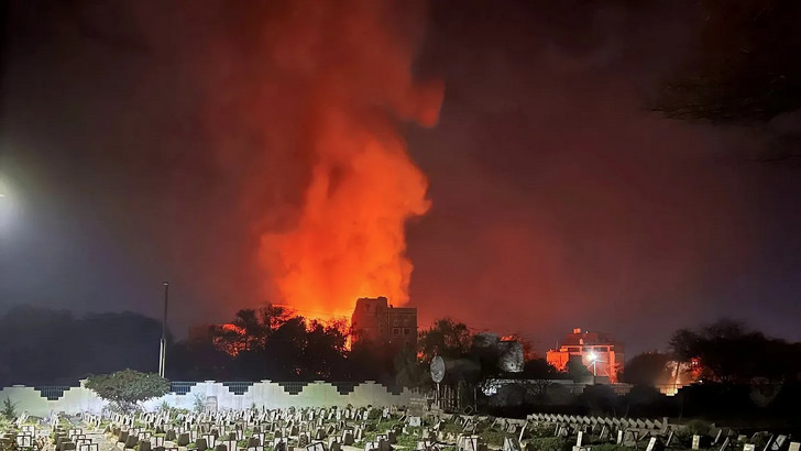 Des images vidéo ont montré d'importantes destructions et des équipes tentant d'éteindre à grand peine les feux qui ravagent l'usine Al-Sawari dans le district de Bani Matar, dans le gouvernorat de Sanaa.