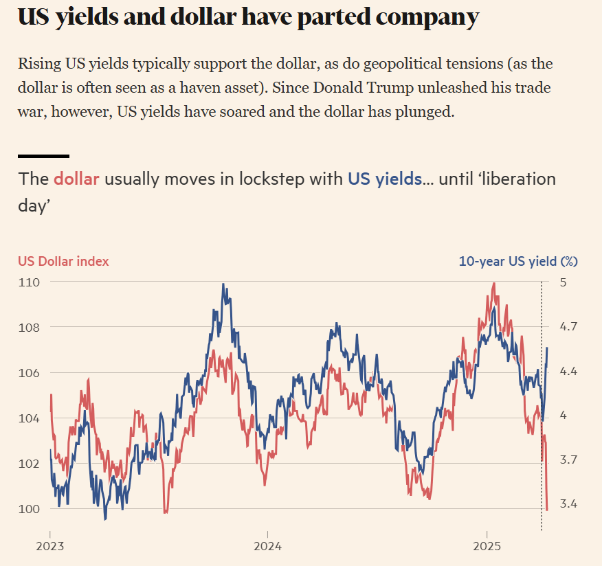 Le programme économique phare de Trump (les droits de douane réciproques) repose sur l'idée erronée que le reste du monde est censé fonctionner comme le distributeur automatique de billets des États-Unis. Mais les investisseurs ne partagent pas cette conviction ; ils pensent que les droits de douane vont déclencher une vente massive d'actifs financiers américains et faire s'effondrer le marché. Et c'est aussi ce que nous dit l'effondrement du marché des bons du Trésor. Extrait d'un article de Politico :