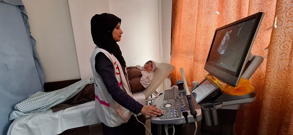 © UNFPA Palestine/Yasmeen Sous. Une femme enceinte se fait traiter dans un établissement de la Société palestinienne de secours médical à Gaza.