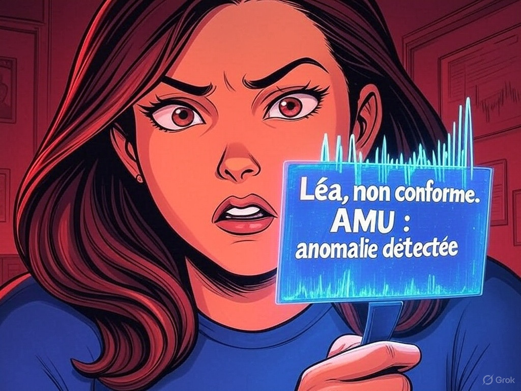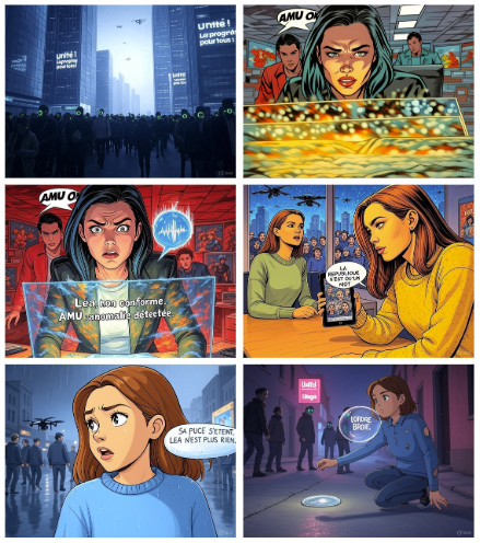 Léa, 32 ans, codeuse, refuserait un contrôle AMU. Sa puce s'éteindrait, les médias la désigneraient : "Non conforme." Hier, elle programmait. Ce soir, elle mendie, hors système. Mais dans l'ombre, le désordre germerait. Léa apprendrait le Verlan, brouillant l'IA. Elle cacherait un « illegs », griffonnerait sur papier. Chaque murmure, chaque C-A-B, rallumerait une étincelle humaine.