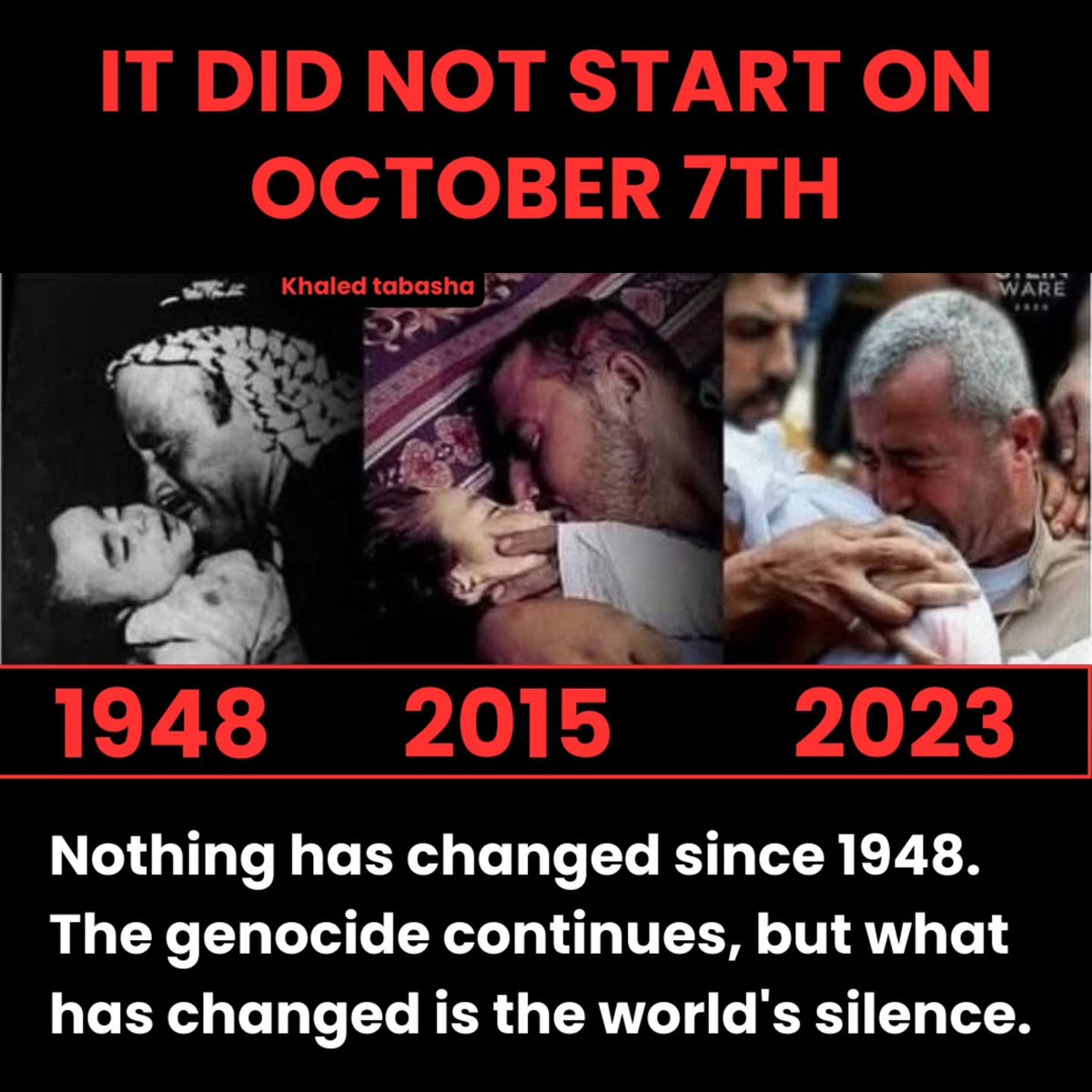 « Cela n'a pas commencé le 7 octobre. 1948 - 2015 - 2023. Rien n'a changé depuis 1948. Le génocide continue, mais ce qui a changé, c'est le silence du monde. »