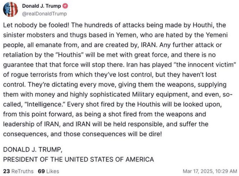 Mais soyons francs : cela n'a rien à voir avec les Houthis, cela a à voir avec les désirs d'Israël ; et ils veulent une guerre avec l'Iran pour anéantir son programme nucléaire. C'est tellement évident, et c'est vraiment dommage.