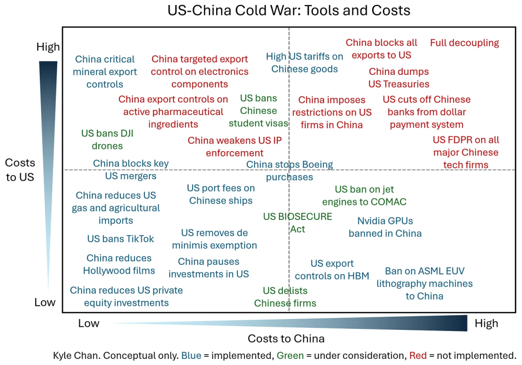 Chaque arme de la guerre froide Américano-chinoise est une arme à double tranchant. Parce que les États-Unis et la Chine sont si profondément intégrés - à la fois en termes de relations bilatérales et en tant que parties d'un système économique mondial hautement intégré - que toute action entreprise par un pays finira par nuire aux deux parties, dans une certaine mesure. La question devient alors : quel est l'équilibre de la douleur ? Êtes-vous capable d'infliger plus de douleur à votre adversaire qu'à vous-même ? Il est utile de cartographier les différents outils et armes en termes de coûts relatifs de chaque côté, comme j'ai essayé de le faire dans le diagramme en haut. Quels outils tombent dans quels quadrants ?
