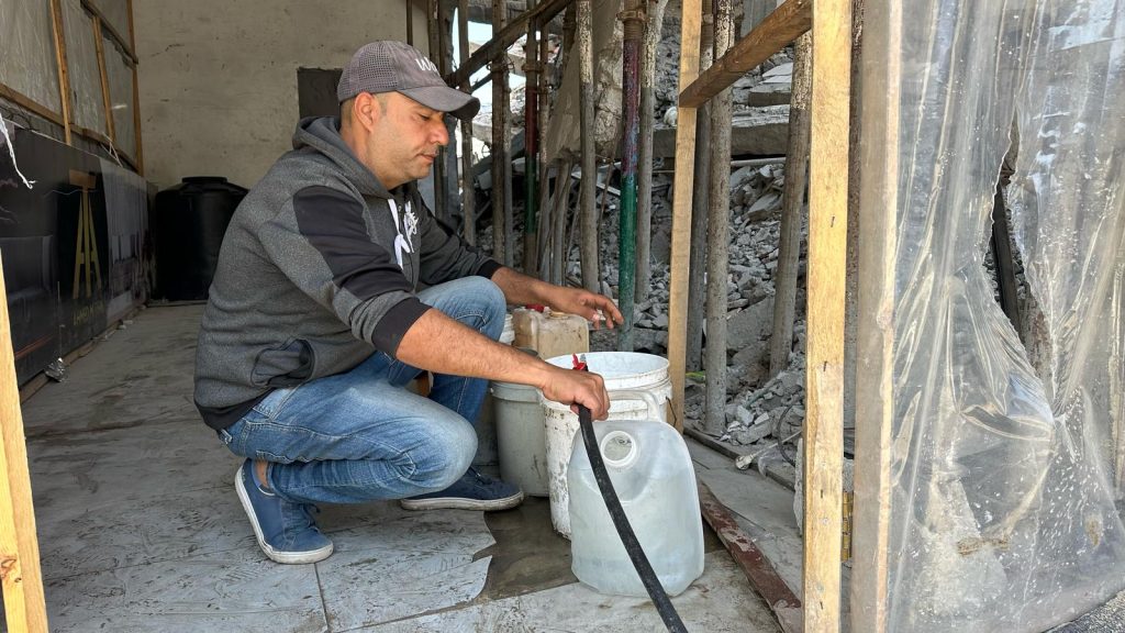 Il commence ses journées en marchant longtemps pour aller chercher de l'eau pour la tente. « J'essaie d'être prioritaire dans les files d'attente pour l'eau », explique-t-il. « Je me rends tôt le matin au seul point d'eau de la zone, car si je n'y arrive pas, ma famille et moi passerons la journée sans eau. »