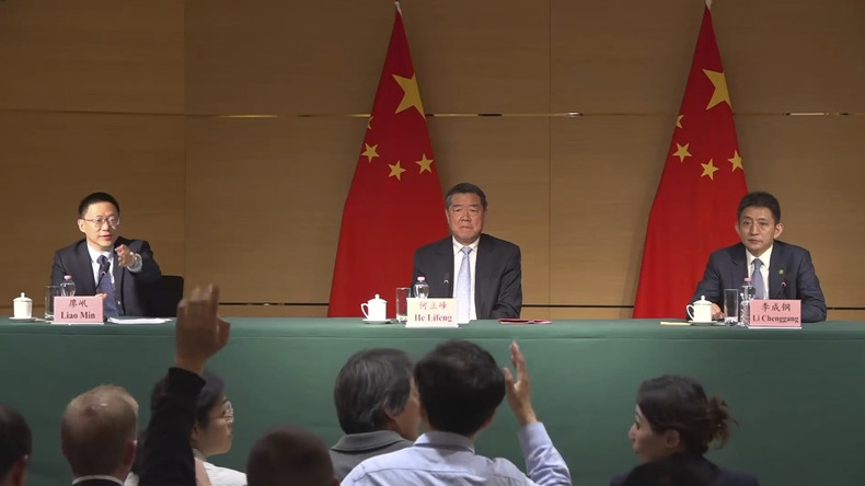 Le vice-ministre chinois des Finances à gauche, s'adresse à un journaliste lors d'une conférence de presse à la mission chinoise auprès de l'Organisation mondiale du commerce à Genève, en Suisse, le 11 mai 2025, aux côtés du vice-Premier ministre et du vice-ministre du Commerce.