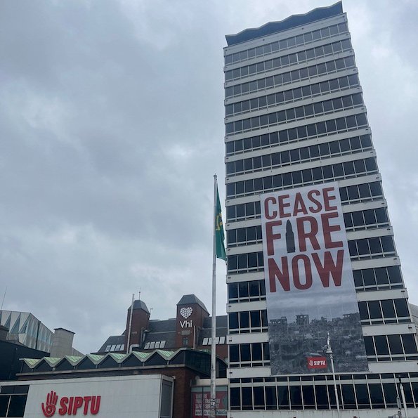 Une immense banderole #CeasefireNow (cessez le feu immédiat) est accrochée au siège du SIPTU College, le grand syndical irlandais, à Dublin.