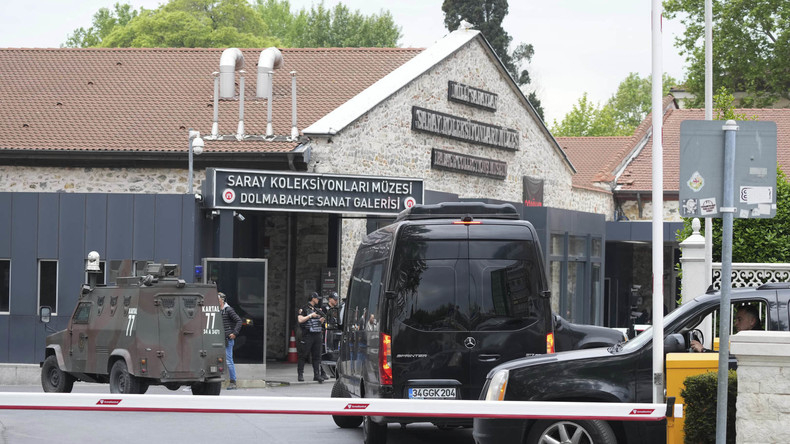 Les véhicules et les services de sécurité commencent à arriver avant les discussions prévues entre les délégations russe et ukrainienne au palais Dolmabahce, à Istanbul, Turquie, le 16 mai 2025.