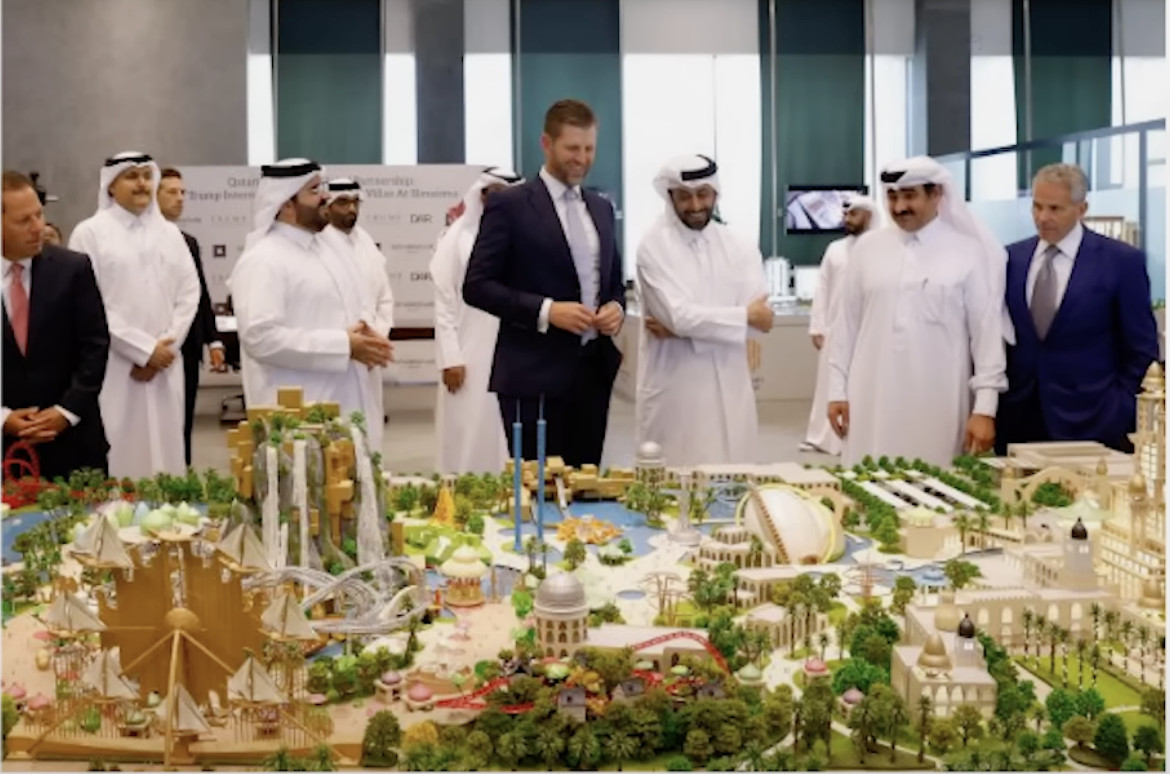 En même temps -documente le Wall Street Journal- "la famille Trump est en train de faire de lucratives affaires au Moyen-Orient, en construisant des stations balnéaires de luxe et en effectuant des opérations de cryptomonnaie et des investissements financiers". Une photo montre le fils du Président des États-Unis, Eric Trump, vice-président exécutif de la Trump Organization, tandis qu'il présente aux gouvernants du Qatar, à Doha, le projet d'une luxueuse station balnéaire.