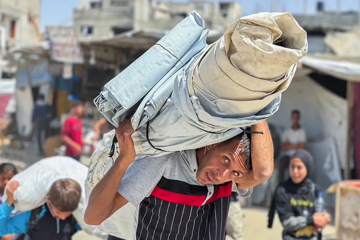 Des Palestiniens transportent leurs biens après les ordres d'évacuation donnés par Israël à Khan Yunis le 19 mai 2025. (Photo © AFP via Getty Images)