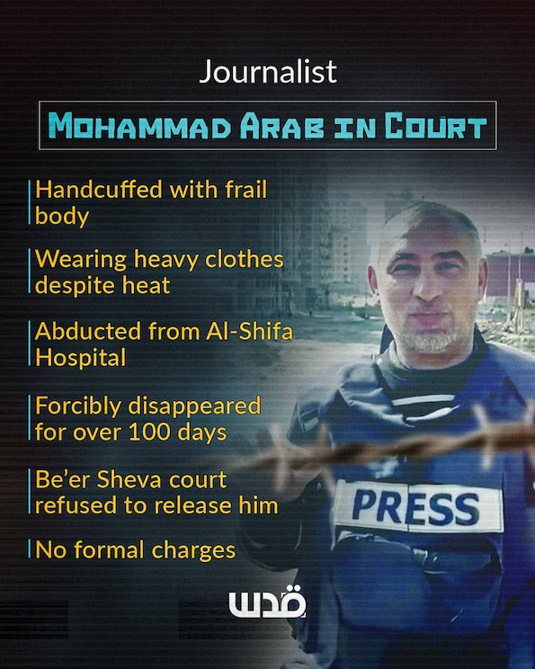 Menotté, frêle et emmitouflé dans d'épais vêtements d'hiver, le journaliste gazaoui Mohammad Arab a comparu la semaine dernière devant un tribunal israélien après 100 jours de disparition forcée.