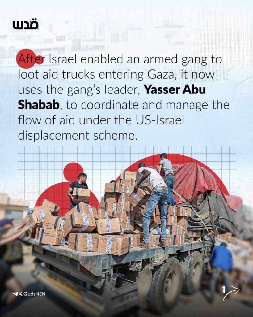 Israël collabore avec le pilleur d'aide, Yasser Abou Shabab, et le protège, lui accordant l'accès aux zones interdites de Gaza et lui permettant activement, ainsi qu'à sa bande, de piller les camions d'aide et d'assassiner les forces de sécurité qui tentent de les arrêter.
