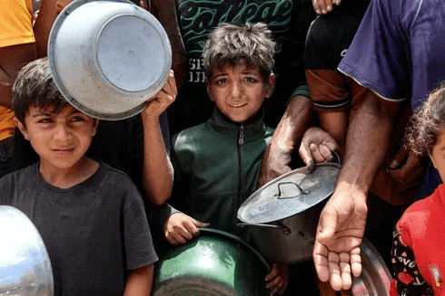 Des enfants palestiniens attendent devant un camion de distribution de repas