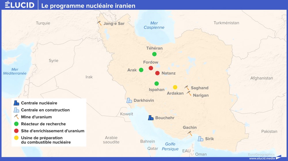 L'Iran dispose actuellement d'une centrale nucléaire en fonctionnement, située à Bouchehr, sur la côte du golfe Persique, et d'une autre centrale nucléaire en construction, à Darkhovin, sur le fleuve Karoun. Un réacteur nucléaire de recherche, à Arak, a été rendu inutilisable il y a des années, à la suite de l'accord de Vienne de 2015. Un autre existait autrefois à Téhéran pour la production de radio-isotopes à usage médical, mais ne pouvait fonctionner qu'avec du combustible très enrichi, que l'Iran pouvait jadis importer, mais qu'il n'a pas actuellement les moyens de produire. Un remplacement pour ce réacteur est actuellement en construction à Ispahan. Enfin, la construction d'une autre centrale nucléaire est prévue à Sirik, sur le détroit d'Ormuz.