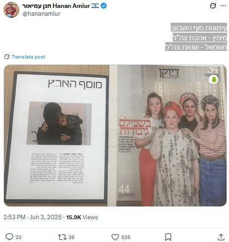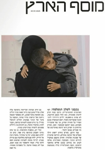 Deux images et une conclusion : Le rédacteur en chef du site de critique des médias Presspectiva, Hanan Amiur, a publié cette semaine sur son compte X la couverture du supplément du magazine Haaretz du week-end en hébreu, ainsi que la couverture du magazine Makor Rishon du week-end. À gauche, une image dure, affligeante et sombre qui ne peut que choquer et toucher le cœur de tout être humain, à l'exception des sadiques fous qui sont de plus en plus nombreux ici. Une mère vêtue de noir porte dans ses bras son fils mourant, un squelette d'être humain, qui s'accroche à elle avec les derniers bouts de sa force, les derniers bouts de son âme, son regard déchirant implorant de l'aide. Un chef-d'œuvre de photographie et un chef-d'œuvre de texte de Nir Hasson du Haaretz : «Nous sommes entrés dans la phase monstrueuse».