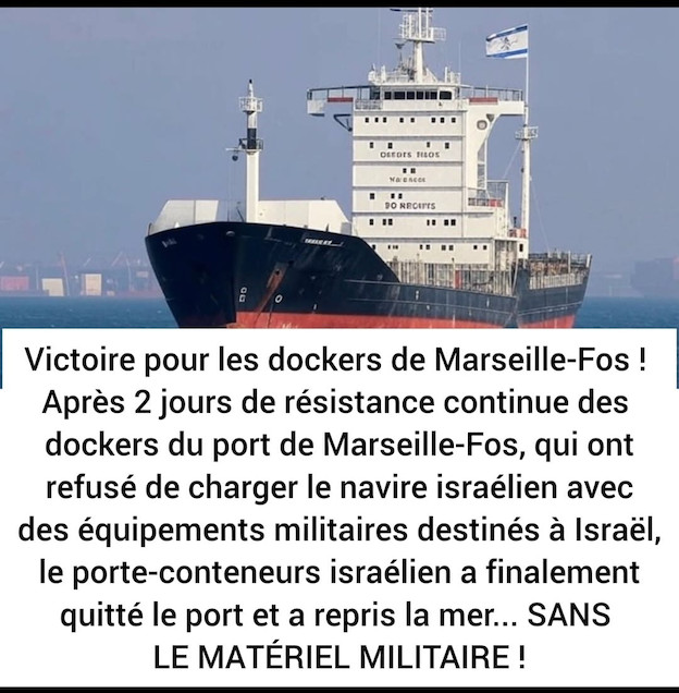 La mobilisation a payé contre le chargement d'armes françaises à destination d'Israël. Nous remercions les dockers qui se sont mobilisés, ainsi que Disclose et The Ditch qui ont révélé cette collaboration militaire de la France avec les génocidaires israéliens.