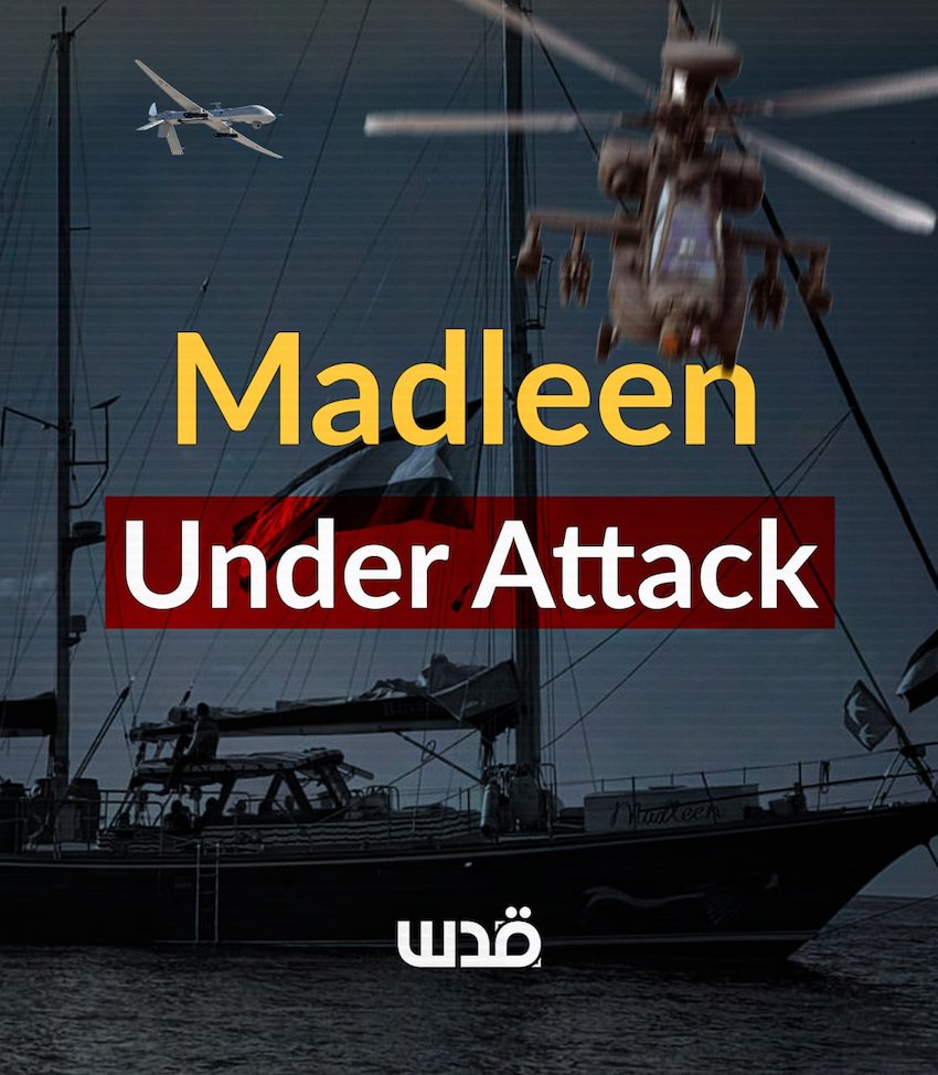 Action surprise ce dimanche soir sur les Champs Élysées à Paris, en soutien à l'appel à l'aide lancé par Rima Hassan et ses camarades de la Flottille pour Gaza à bord du Madleen, menacés d'une attaque annoncée dimanche par les pirates génocidaires israéliens.