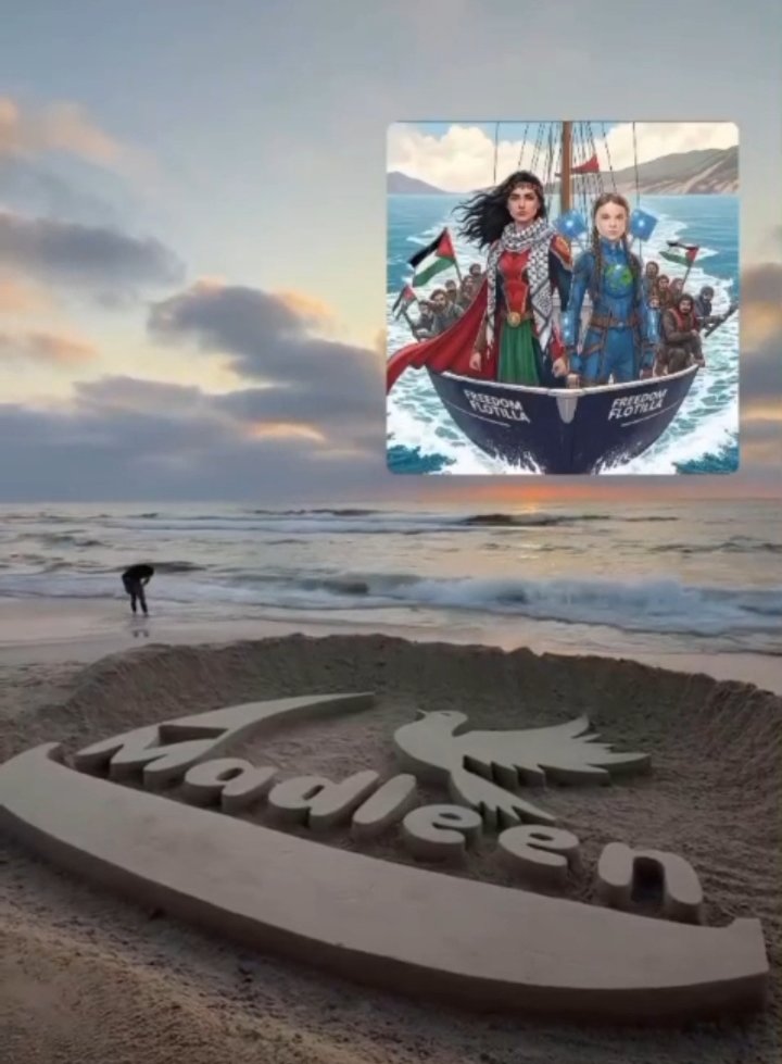 L'artiste gazaoui Yazid Abu Jarad sculpte une image du navire humanitaire Madleen sur la côte de Gaza en signe de soutien aux militants détenus par l'occupation israélienne.