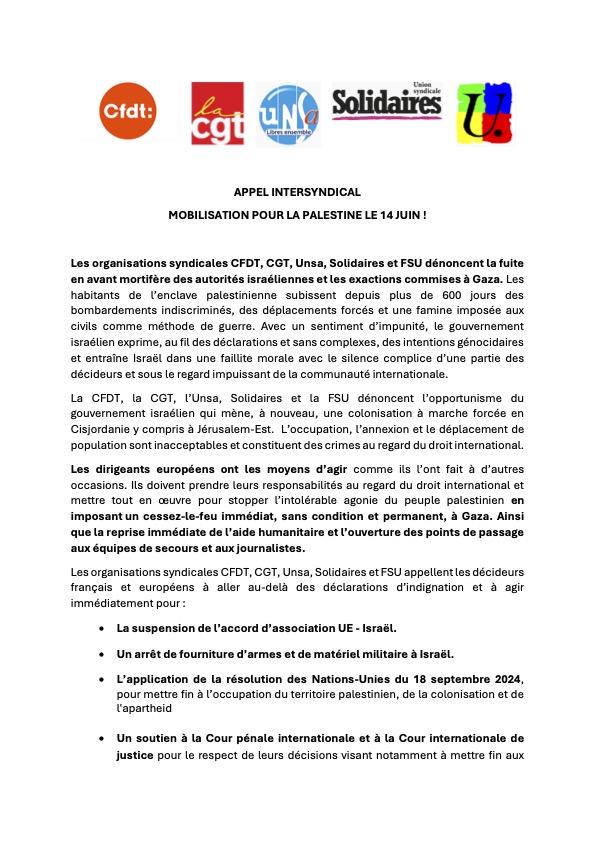 « Les habitants de l'enclave palestinienne subissent depuis plus de 600 jours des bombardements indiscriminés, des déplacements forcés et une famine imposée aux civils comme méthode de guerre, rappellent les organisations dans leur communiqué. Le gouvernement israélien exprime des intentions génocidaires avec le silence complice d'une partie des décideurs et sous le regard impuissant de la communauté internationale. » En plus de la situation à Gaza, elles dénoncent la « colonisation à marche forcée » d'Israël en Cisjordanie et à Jérusalem-Est. Face à cette atteinte au droit international, l'intersyndicale somme les dirigeant·es européen·nes d'agir immédiatement.