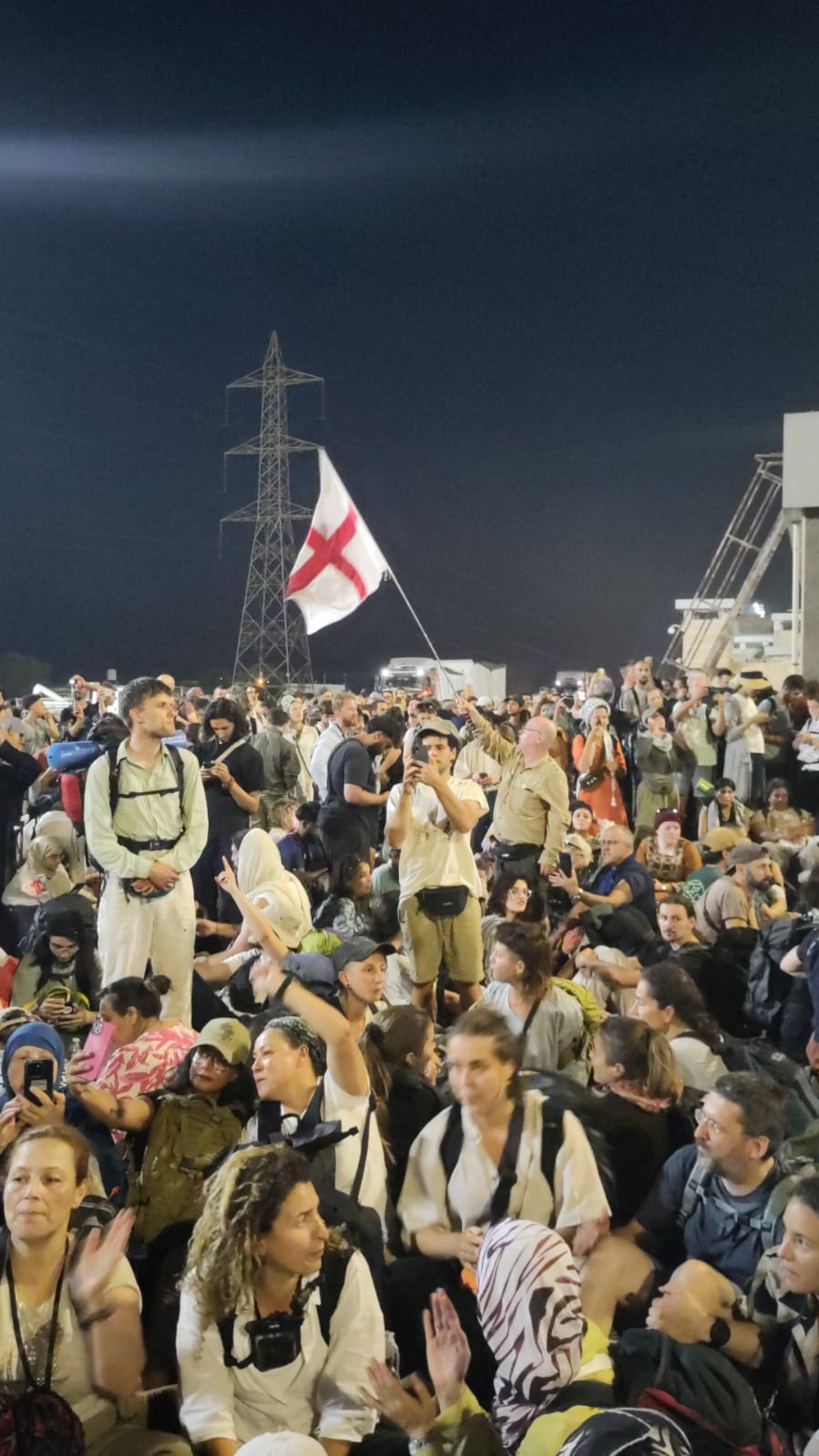 Après trente minutes de discussion au sein de la délégation suisse - 83 ressortissants, l'une des plus grande -, on nous informe que les marcheurs du check-point 1 ont été arrêtés et déportés. Ils se trouvaient de toute façon à 35 km, soit plus de huit heures de marche. Nous décidons donc de rester.