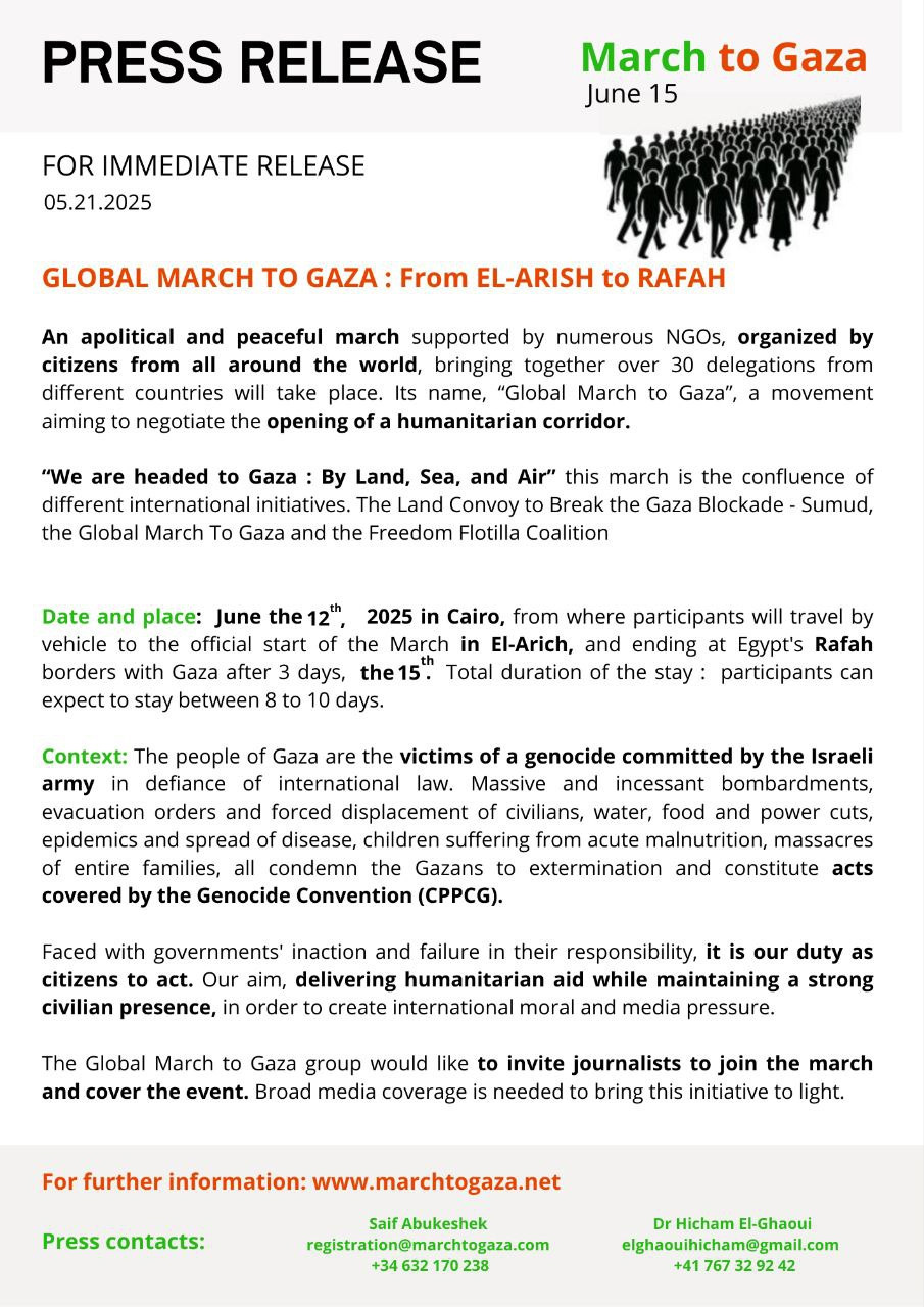Dans ce contexte, et face à l'impuissance généralisée, une marche citoyenne internationale s'organise. Des délégations venues du monde entier tentent de se réunir pour briser le blocus de l'enclave palestinienne, devenue prison à ciel ouvert, puis aujourd'hui camp d'extermination, et forcer l'entrée de l'aide humanitaire par le passage de Rafah.