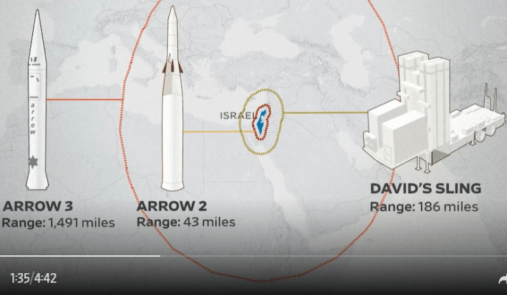 Selon le WSJ, le système de défense aérienne israélien est divisé en quatre niveaux : le Dôme de Fer (4 à 70 kilomètres), la Fronde de David (40 à 300 kilomètres), Arrow 2 (500 kilomètres) et Arrow 3 (2400 kilomètres).