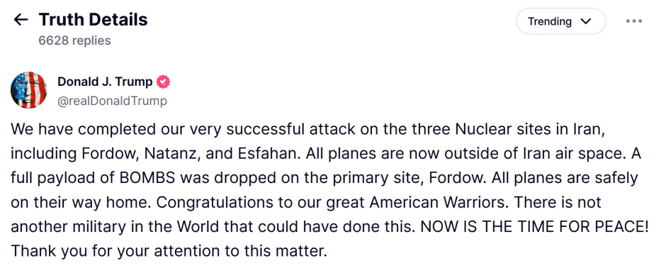 Trump a posté une  capture d'écran d'un tweet du compte « Open Source Intel », se vantant : « Fordow est parti » - une référence à une usine iranienne d'enrichissement d'uranium.