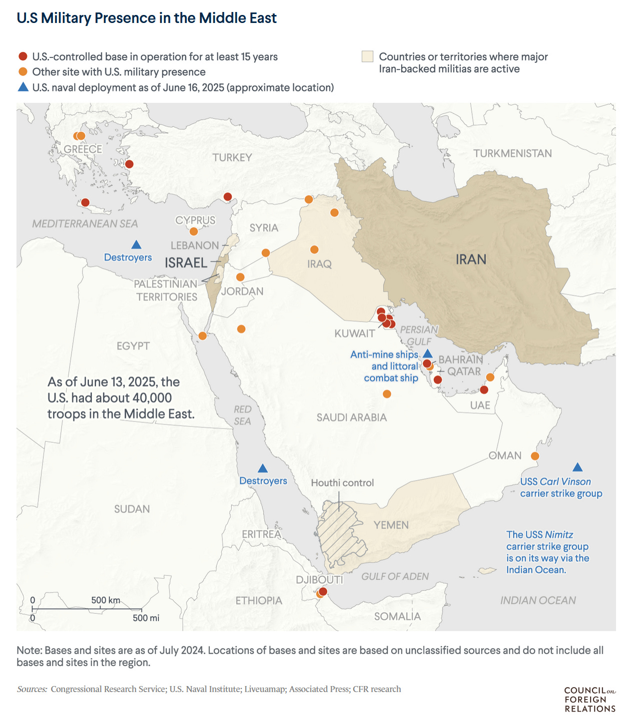 Au 13 juin, les États-Unis avaient au moins 40 000 soldats en Asie occidentale (ce qu'on appelle le Moyen-Orient) et avaient accès à  des dizaines de bases militaires.