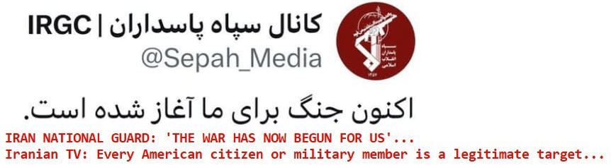Hier soir, les médias iraniens ont publié cette déclaration de la Garde nationale iranienne, telle qu'elle apparaît sur  DrudgeReport.com :