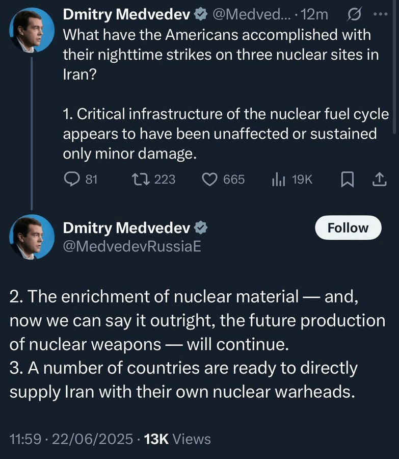 Des propos tout aussi sérieux ont été tenus ce matin par la Russie. L'ancien président russe Dmitri Medvedev a publié ce message sur les réseaux sociaux :